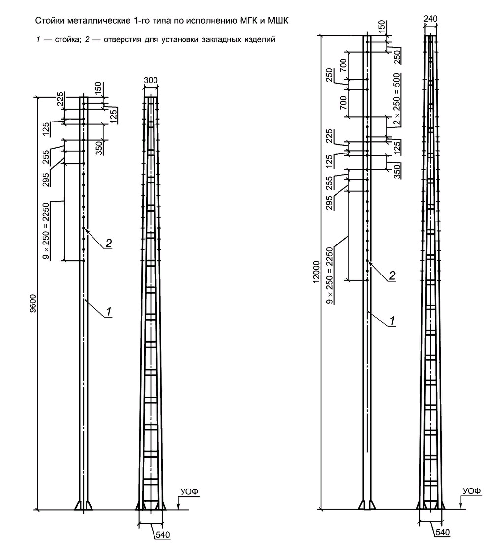 • MKC-9Г-1,З-Л. Так обозначаются многогранные опоры для контактных сетей, с длиной надземной части 9 м, предназначенные для монтажа в грунт. Максимальная нагрузка на верхнюю часть конструкции 1 З00 кг. В комплектацию входит лючок обслуживания.