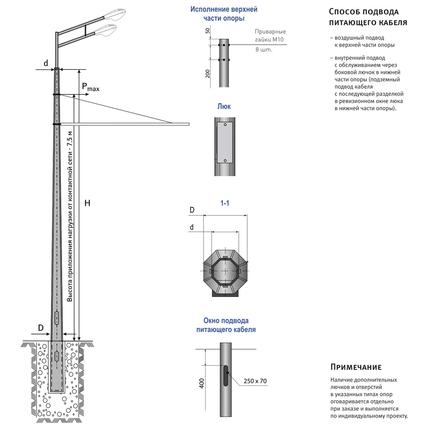 Подвод электрокабеля к опорам выполняется воздушным и подземным способом. Во втором случае разделка кабеля осуществляется в ревизионном окне люка, который располагается в нижней части опоры. При изготовлении конструкций под заказ возможно проектирование опор с дополнительными лючками и отверстиями.